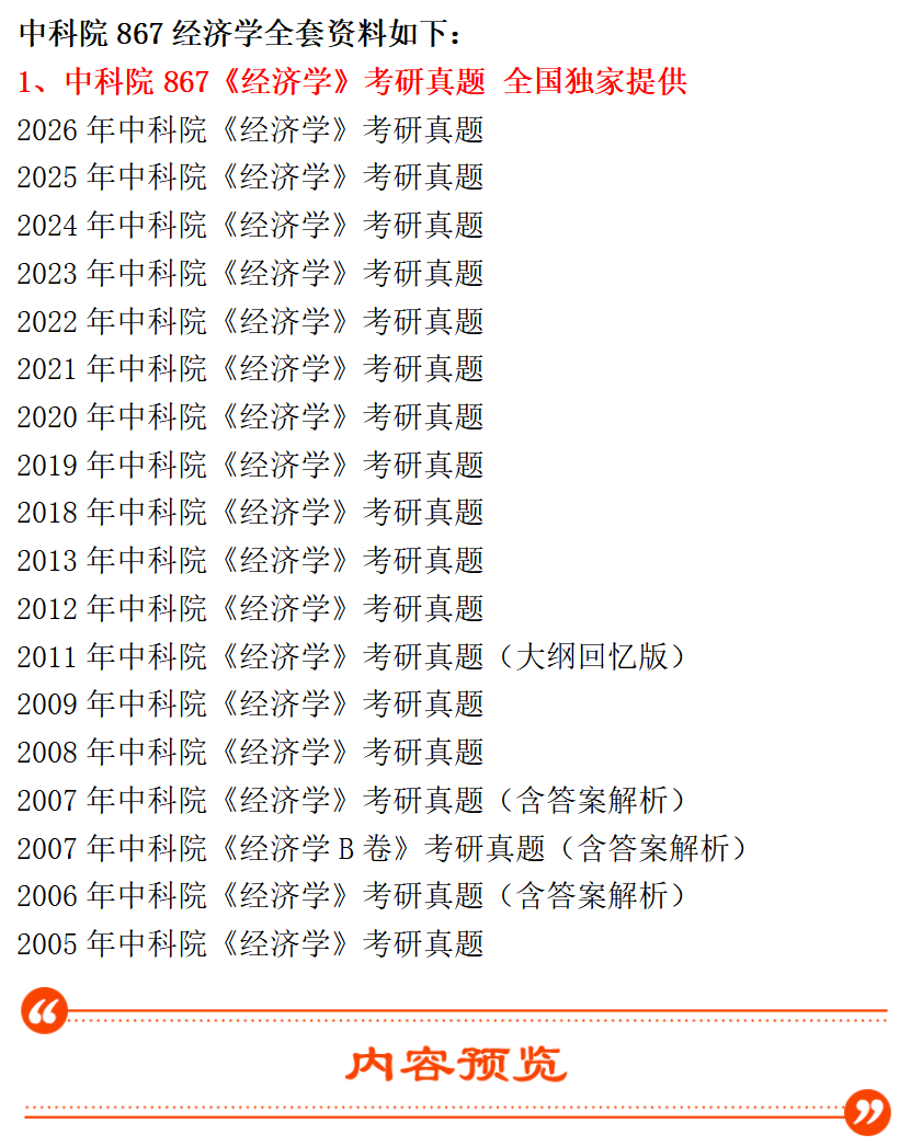 基础套餐包含:中科院2005-2009、2011-2013、2018-2026年经济学考研真题