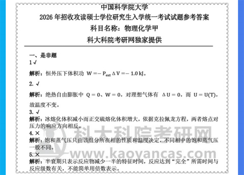 2027年中科院 国科大619物理化学甲考研真题答案初试咨询辅导课程
