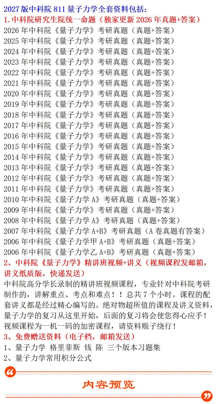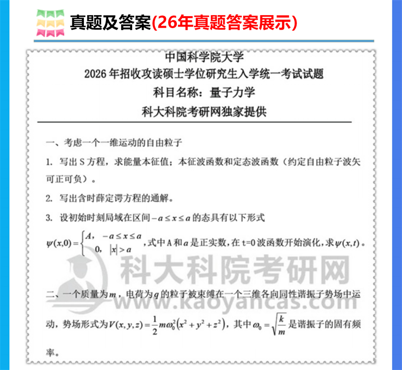 基础套餐包含:中科院2006-2026年量子力学考研真题及答案;参考试题:中科大1990-2013年真题及答案;考研基础+强化班视频+讲义