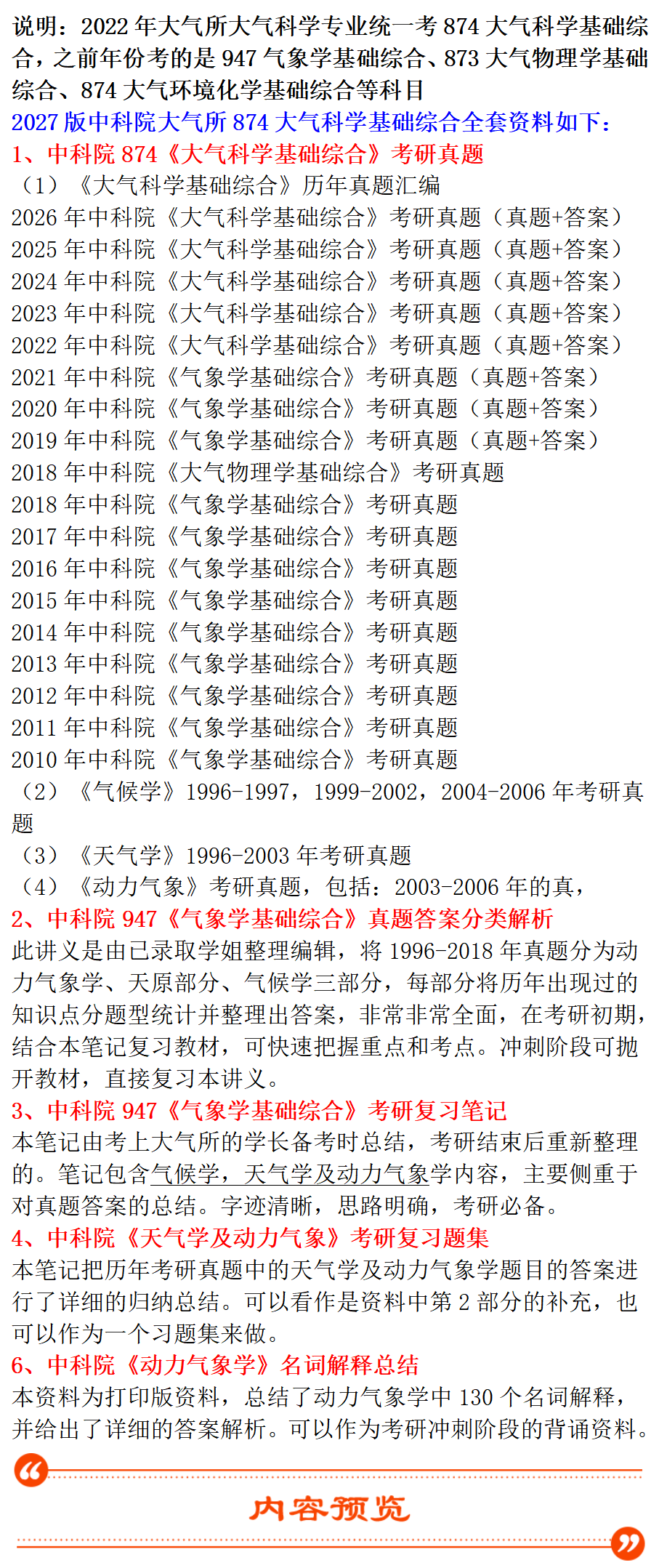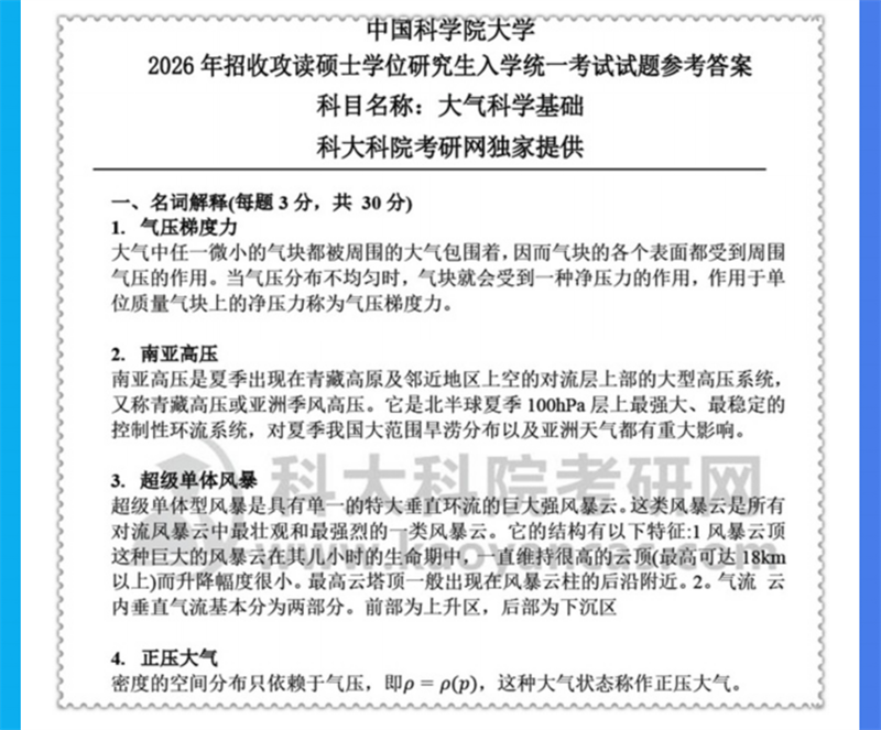 基础套餐包含:中科院2022-2026年大气科学基础综合考研真题及答案;2010-2021年气象学基础综合考研真题,其中2019-2021年有答案;2018年大气物理学基础综合考研真题;1996-2018年真题分类解析;考研复习笔记(气候学,天气学及动力气象学);天气学及动力气象学复习题集、动力气象学名词解释汇总