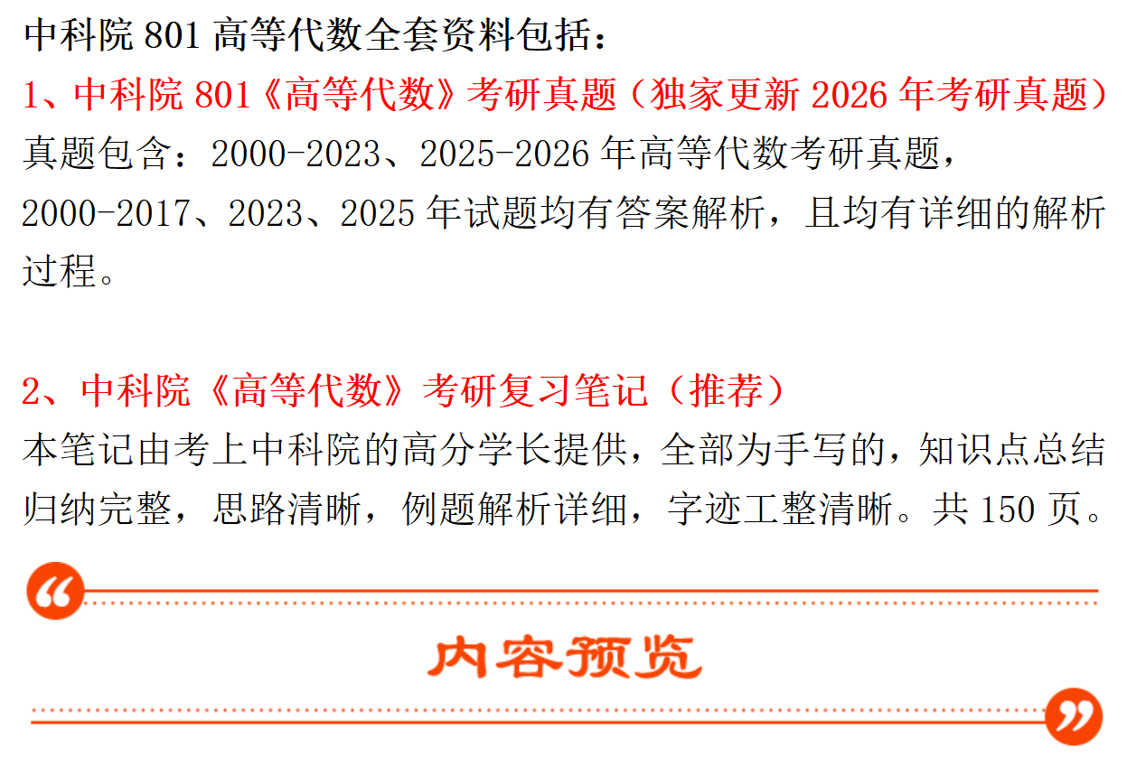 基础套餐包含:中科院2000-2023、2025-2026年高等代数考研真题,其中2000-2017、2023、2025年有答案;考研复习笔记