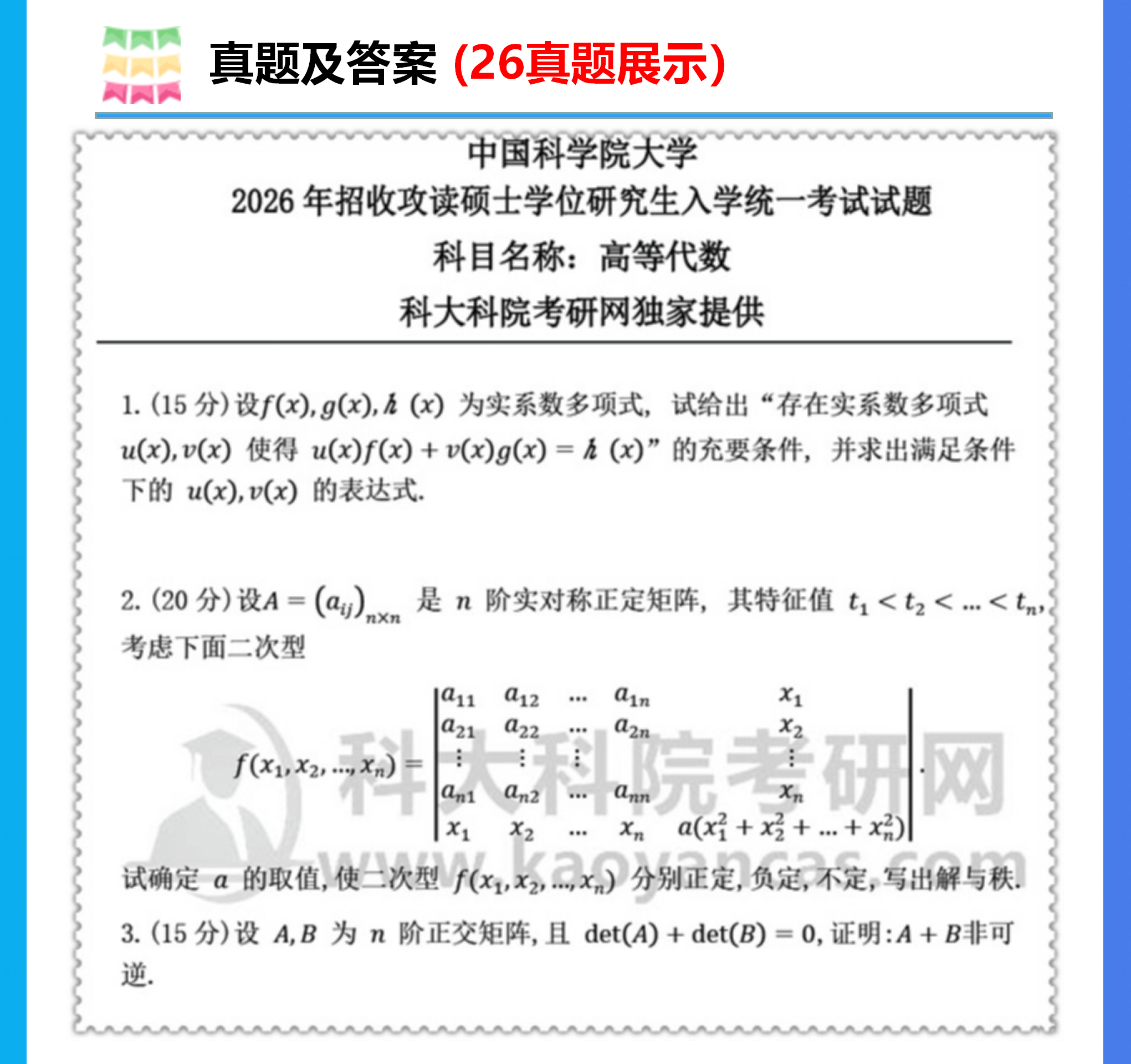 2026年中科院 国科大801高等代数考研真题答案初试咨询辅导课程