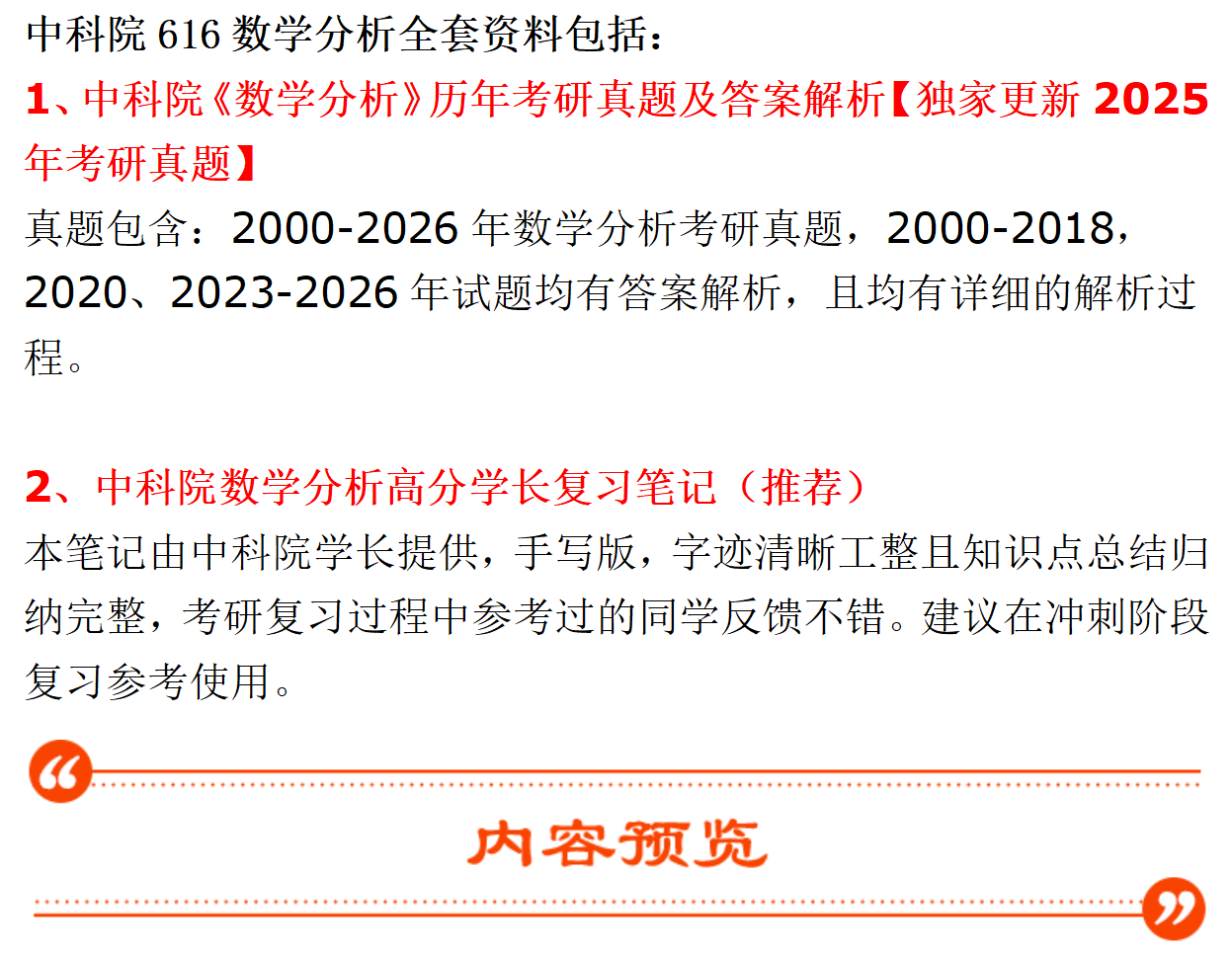 基础套餐包含:中科院2000-2026年数学分析考研真题,其中,2000-2018、2020、2023、2025-2026年有答案;考研复习笔记