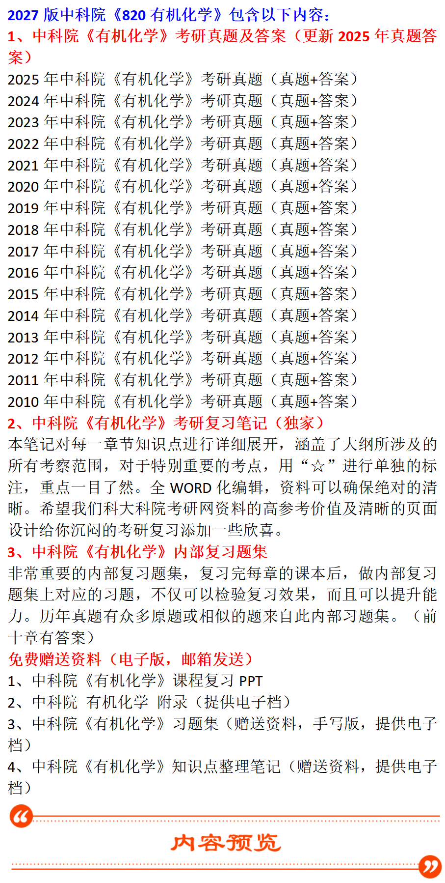 基础套餐包含:中科院2010-2025年中科院有机化学考研真题及答案;考研复习笔记;考研复习题集(前十章有答案)