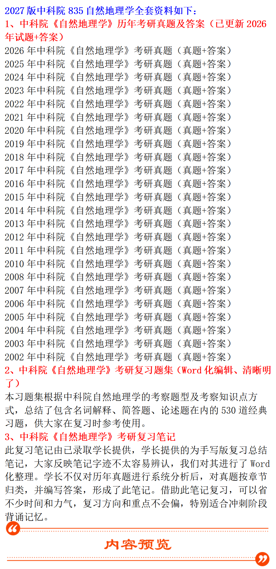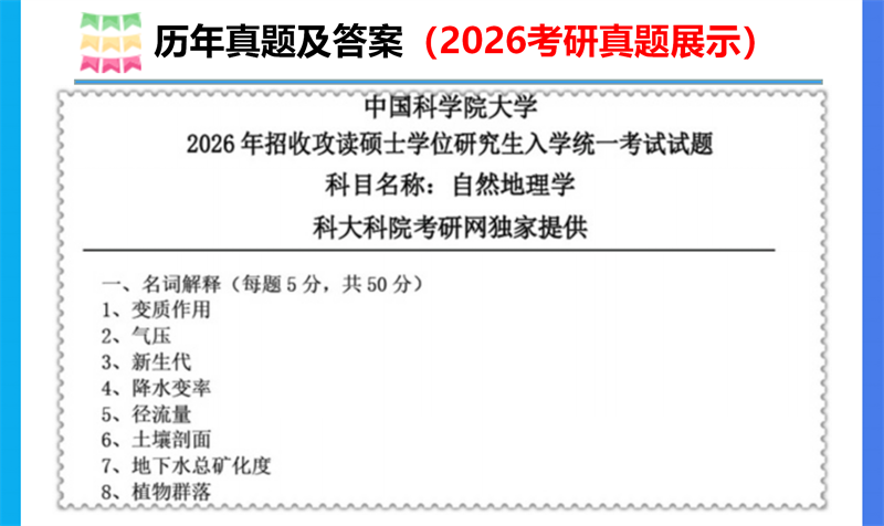 基础套餐包含:中科院2002-2008、2010-2026年自然地理学考研真题及答案;考研复习笔记、考研复习题集