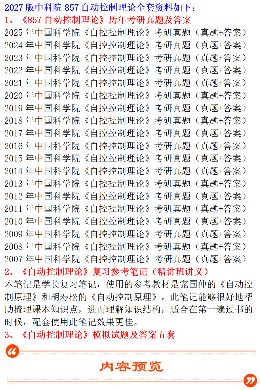 基础套餐包含:中科院2007-2025年自动控制理论考研真题及答案;考研精讲班复习讲义;模拟试题及答案五套