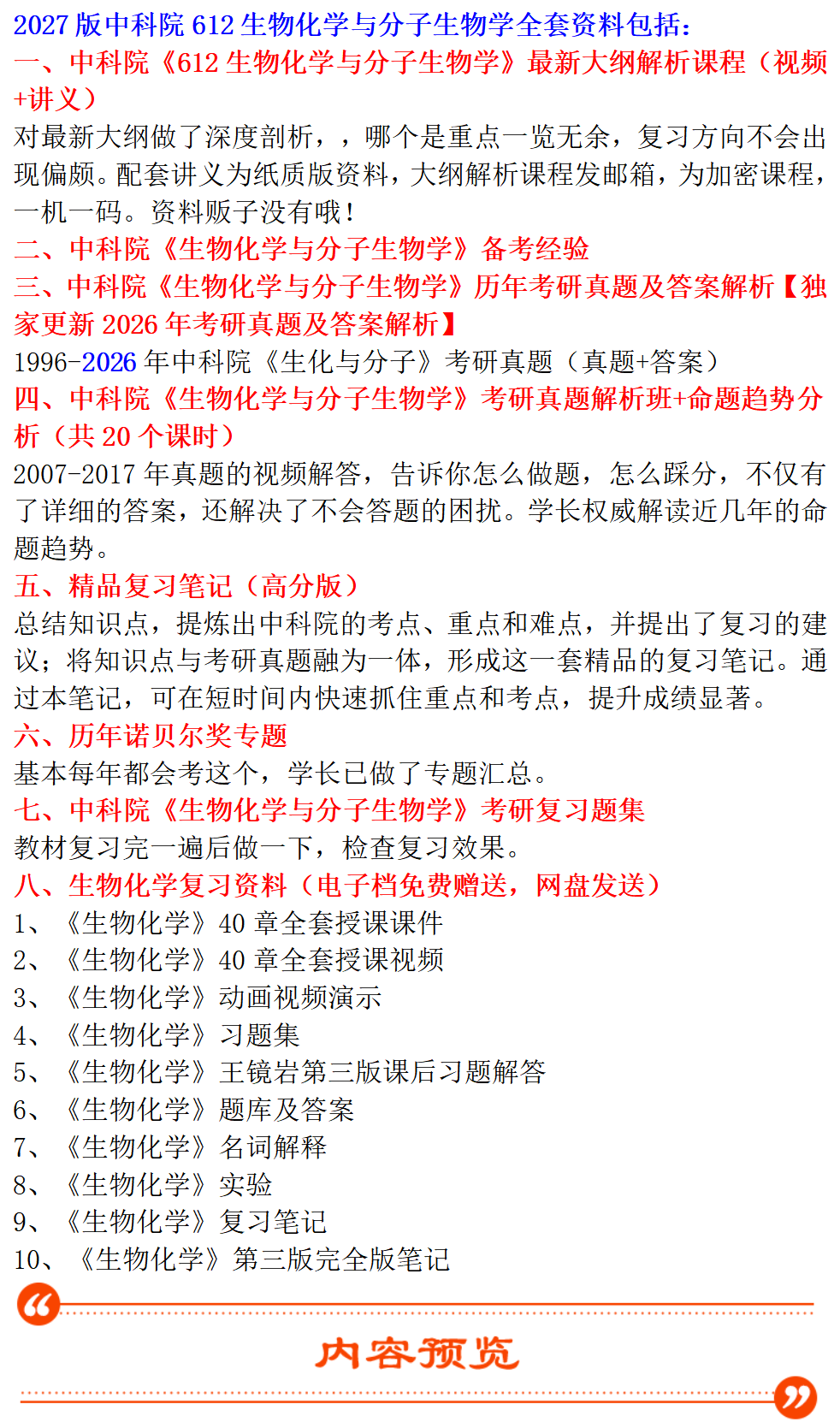 基础套餐包含:备考经验;1996-2026年生化与分子考研真题及答案,其中2007-2017年有真题解析班视频;考研复习笔记;考研复习题集、诺贝尔奖专题、大纲解析班视频+讲义