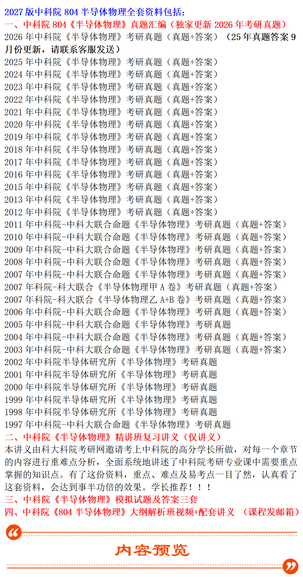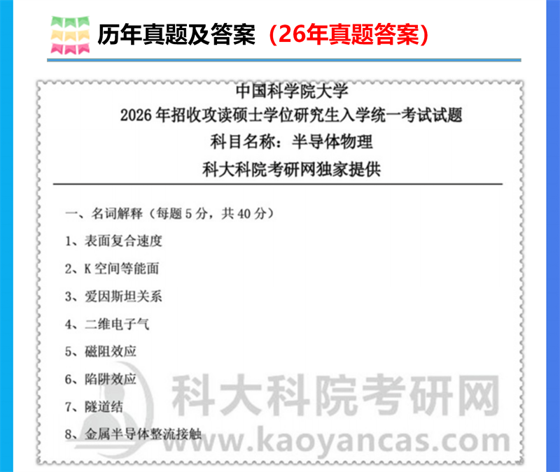 基础套餐包含:中科院1997-2013、2015-2026年半导体物理考研真题,其中1997-2002、2005年无答案,其他年份均有答案;精讲班复习讲义;模拟试题及答案三套、大纲解析班视频+讲义