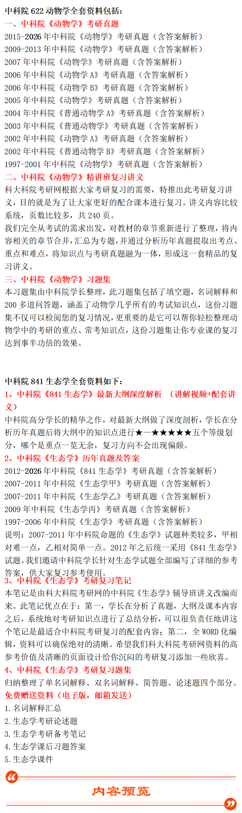 2027年 中科院 国科大 622动物学+841生态学 考研真题答案初试咨询辅导课程